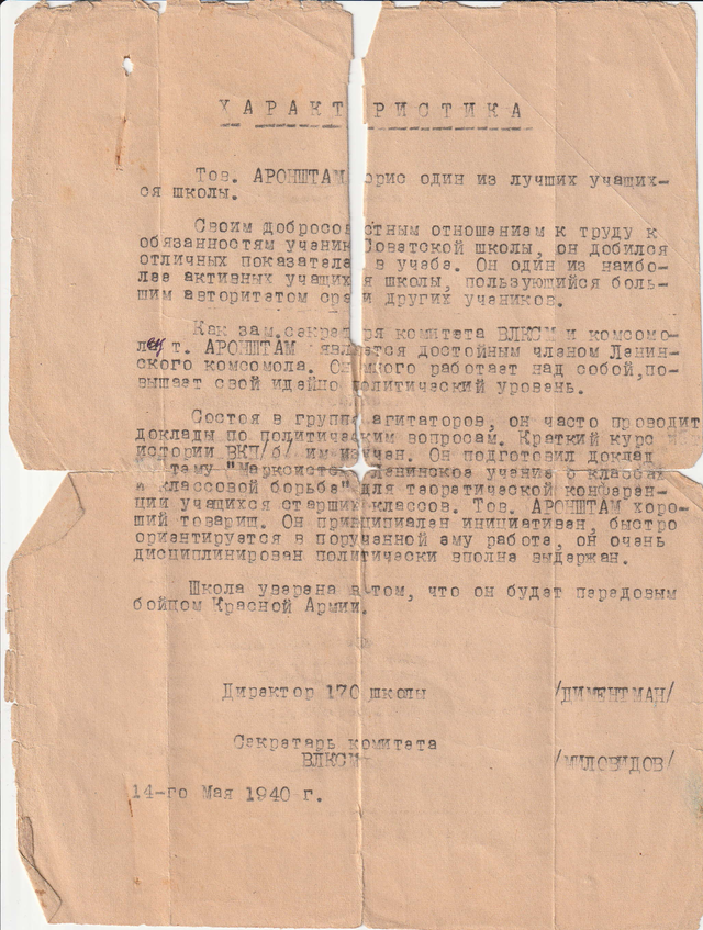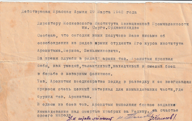 Описание: в документе указано, что Борис Аронштам служил разведчиком, проявил мужество и находчивость, погиб при выполнении боевого задания.