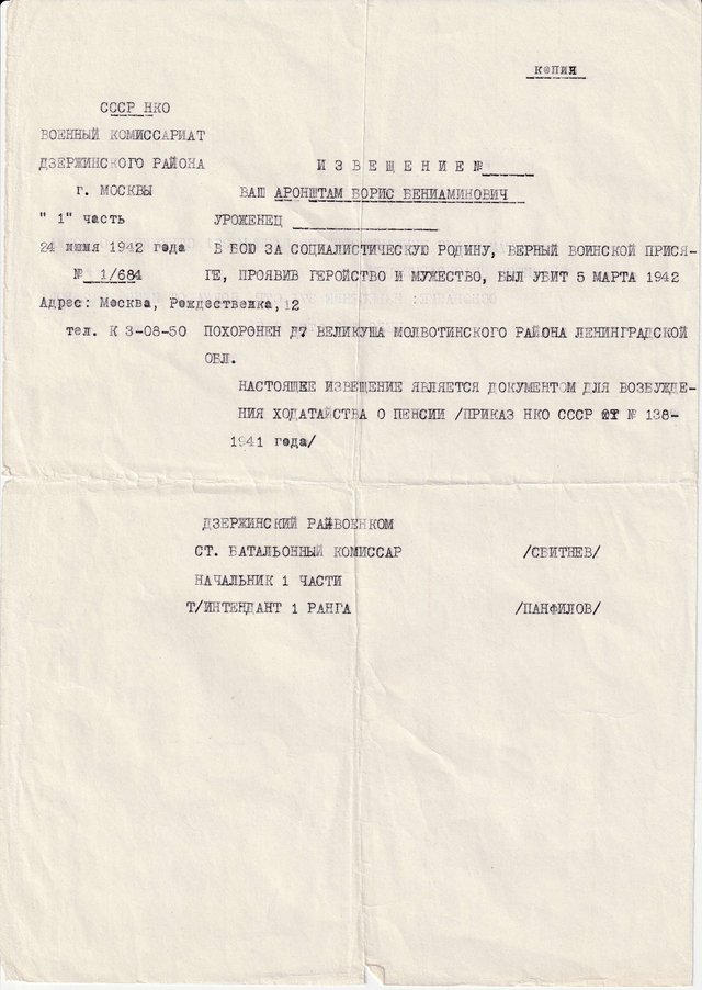 Описание: официальный документ военкомата, подтверждающий гибель 5 марта 1942 года и место первичного захоронения.