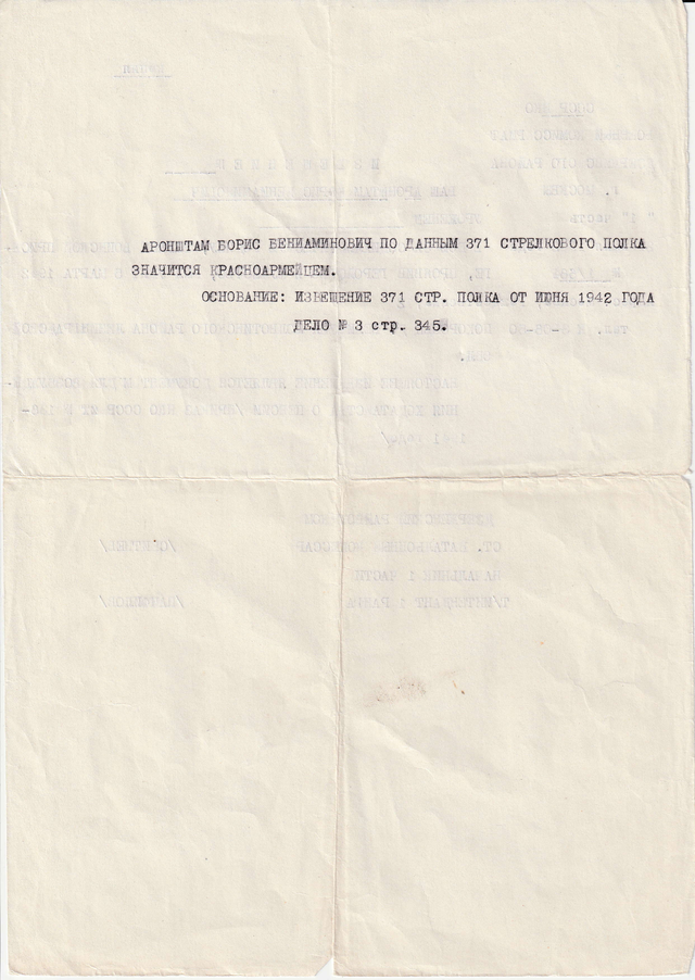 В загруженных материалах указано, что Борис Аронштам был студентом МАИ и служил в рядах действующей Красной Армии. По данным 371-го стрелкового полка он значится красноармейцем.