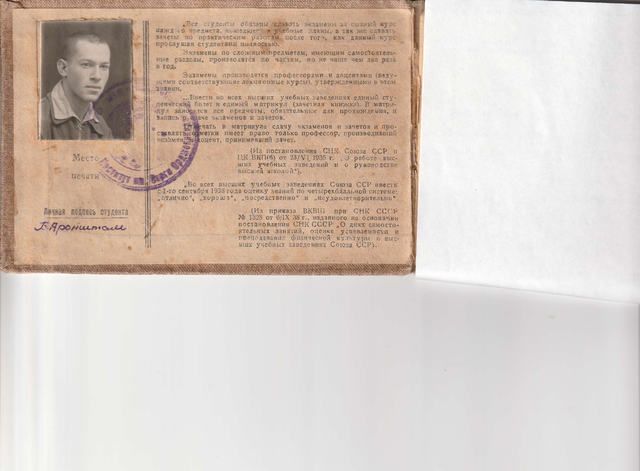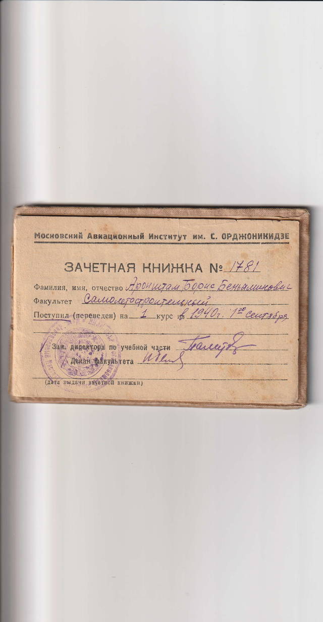 12 сентября 1940 года поступил на 1 курс самолётостроительного факультета Московского авиационного института имени Серго Орджоникидзе. В зачётной книжке указан номер 1781.