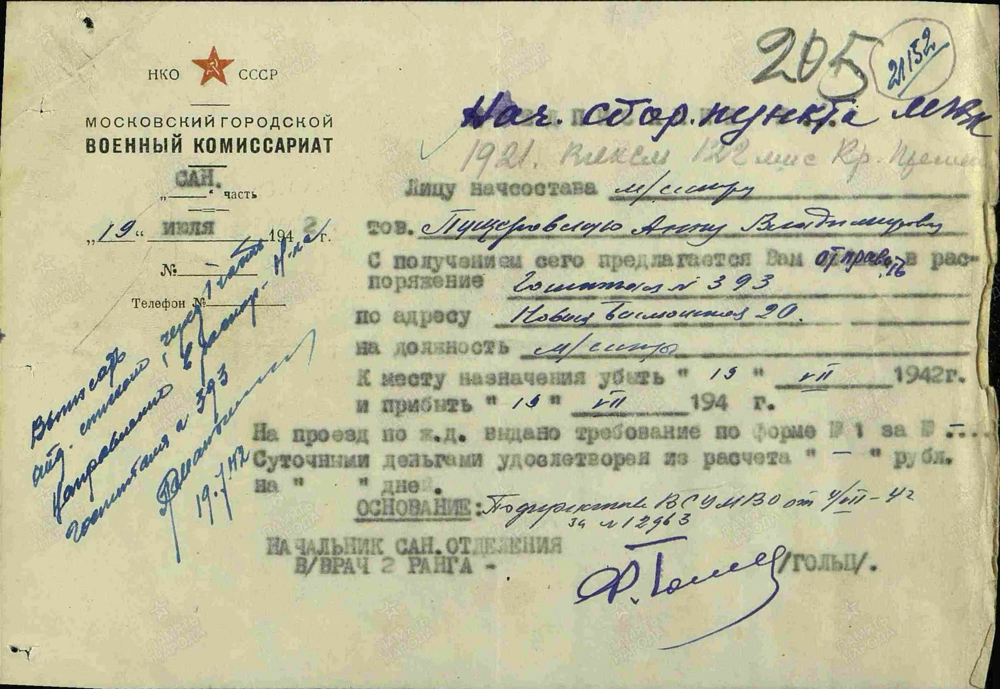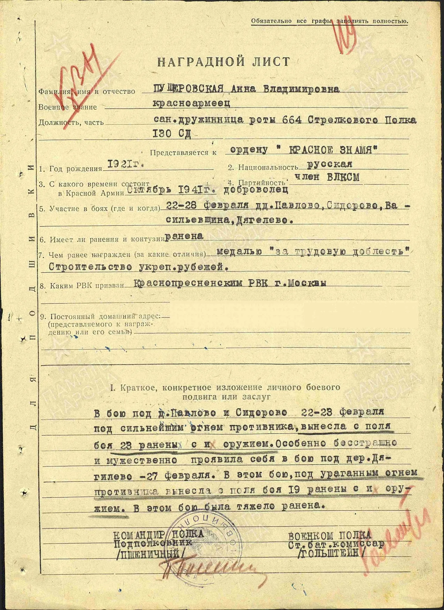 Доброволец. Призвана через Краснопресненский РК ВКП (б) 15 октября 1941 г.