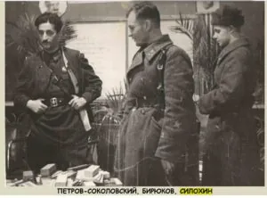 Политотдел дивизии и редакция дивизионной газеты "На защите Москвы" располагались на втором этаже здания. Здесь, в одном из школьных классов помещался кабинет начальника политотдела, батальонного комиссара К.А. Бирюкова, здесь же работал помощник начподива по комсомолу младший политрук К. Силохин.