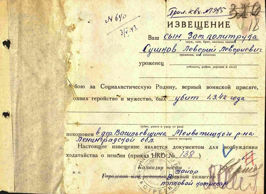 Первичное место захоронения: Ленинградская обл., Молвотицкий р-н, д. Дягилево